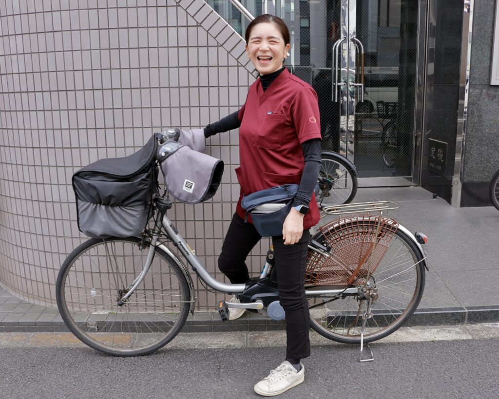 蒲田のまちを電動自転車で走りながら、ストーマや褥瘡(じょくそう)などの創傷ケアを専門に地域を支えるツインハート在宅クリニックの看護師・野口祥子さん。「皮膚・排泄ケア認定看護師(WOC)」として、特定行為研修も修了しています。北九州での訪問看護、病院勤務を経てたどり着いたのは、「患者さんを診る」だけでなく「地域を育てる」看護でした。蒲田で広がる野口さんの取り組みと、その原点にある想いを伺いました。